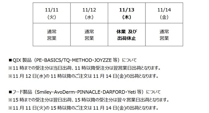 2025年11月13日(木):休業および出荷休止