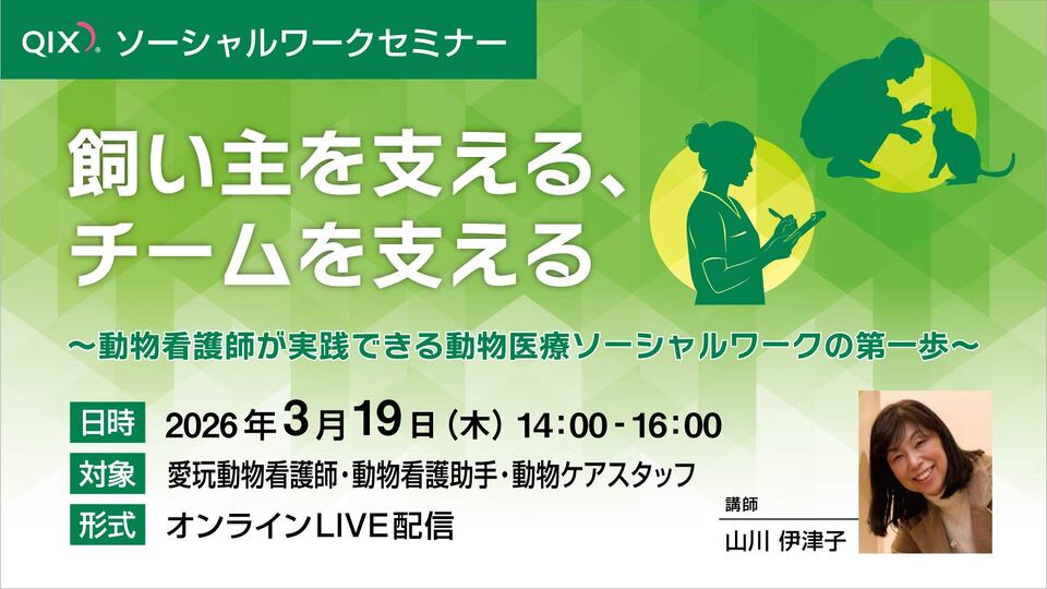 人の福祉と動物福祉の両方を守っていく仕事「動物医療ソーシャルワーク / Veterinary Social Work」について動物看護師視点で学ぶQIXオンラインセミナー「飼い主を支える、チームを支える~動物看護師が実践できる動物医療ソーシャルワークの第一歩~」を3月19日に開催し、終了いたしました。